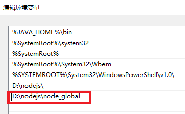 npm config set prefix "D:\nodejs\node_global" npm config set cache "D:\nodejs\node_cache"