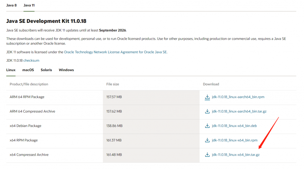 1、官网下载tar.gz后缀的安装包 https://www.oracle.com/java/technologies/downloads/#java11