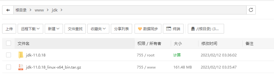 2、新建一个jdk文件夹,用宝塔面板把安装包上传到这个文件夹里,并且解压