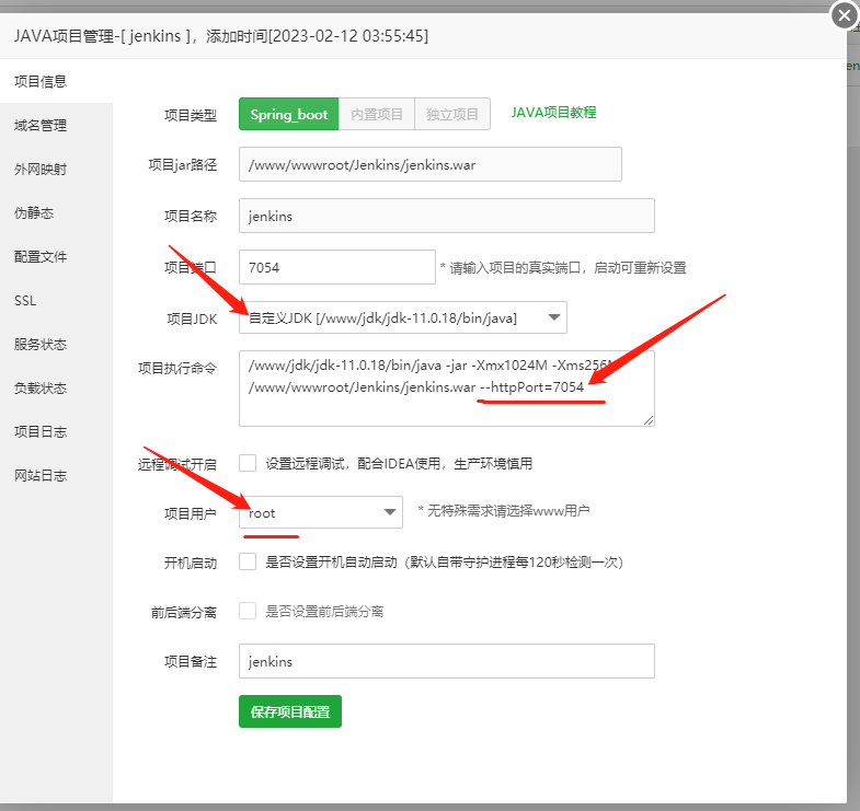 3.第二个项目用户要调成root,否则后面执行脚本会权限不足(这个耽误了很久,尝试给springboot权限失败了,这里只能选root避免权限不足)